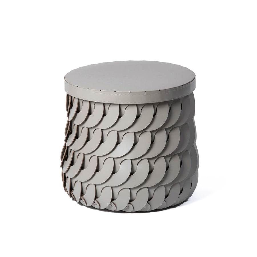 With a refined approach to a classic storage element, the Alicante basket is composed of S-shaped taupe leather elements intersecting one another, fixed on both ends with polished chrome pins.