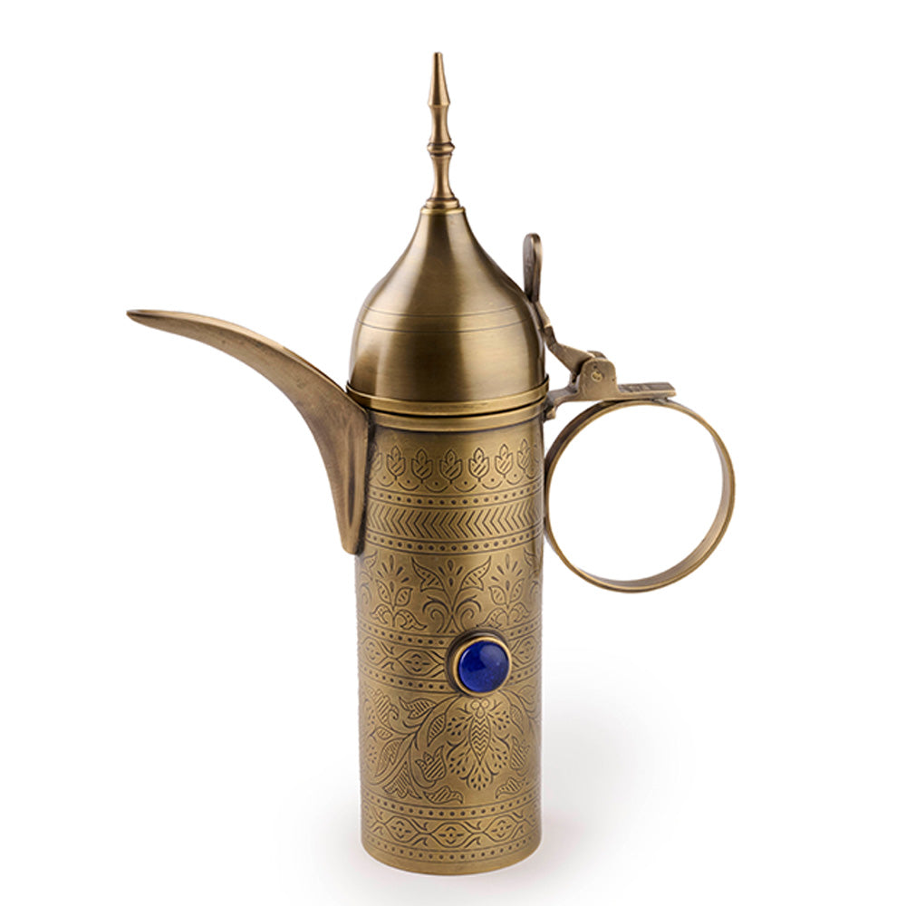 Add a splash of color and excitement to your tea time with the Blue Stone Dallah. This stylish Dallah features an antique matte brass finish and boasts a bright blue stone.
