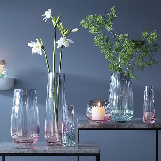 A new collection of glassware by LSA International. Handpainted sheer lustres fade towards the middle of each piece. The subtle iridescent effect is intensified by the optic texture of the mouthblown glass
