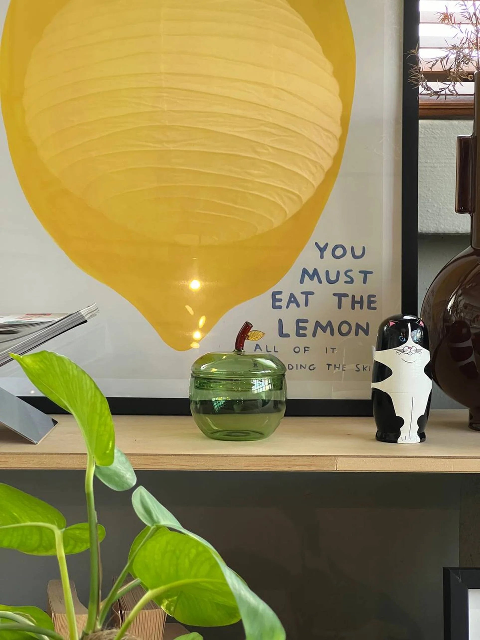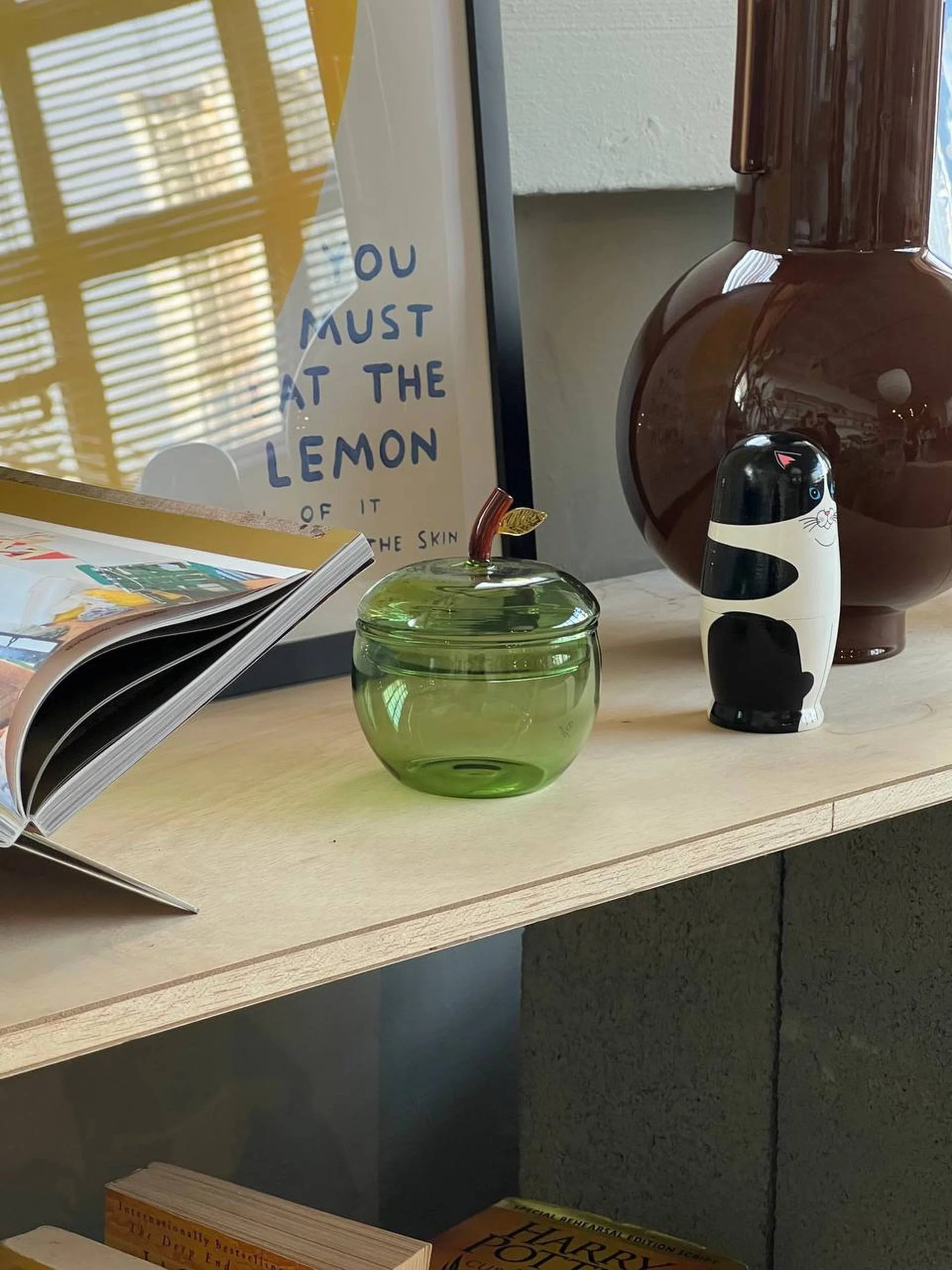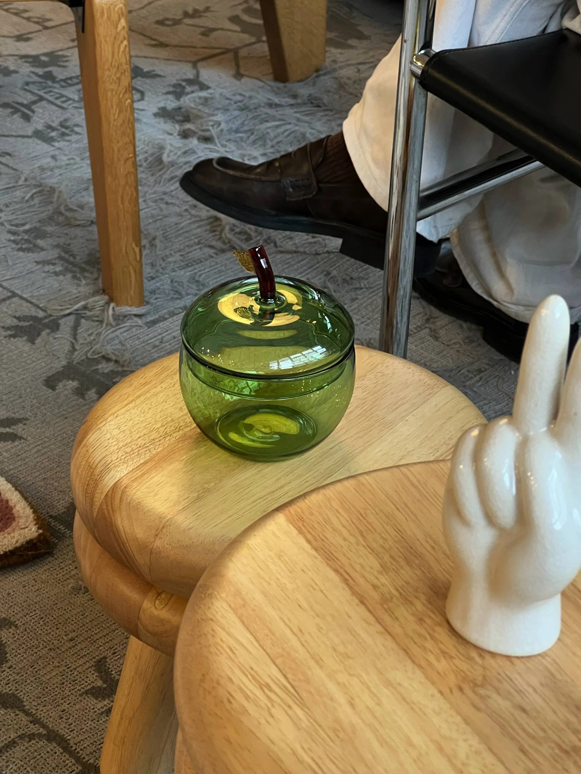 This hand made glass sugar bowl adds whimsy and color to any table setting. With a cute apple design and a capacity of 13.5 ounces, it is both functional and charming. Made with expert craftsmanship, this sugar bowl is a delightful addition to your kitchen collection.