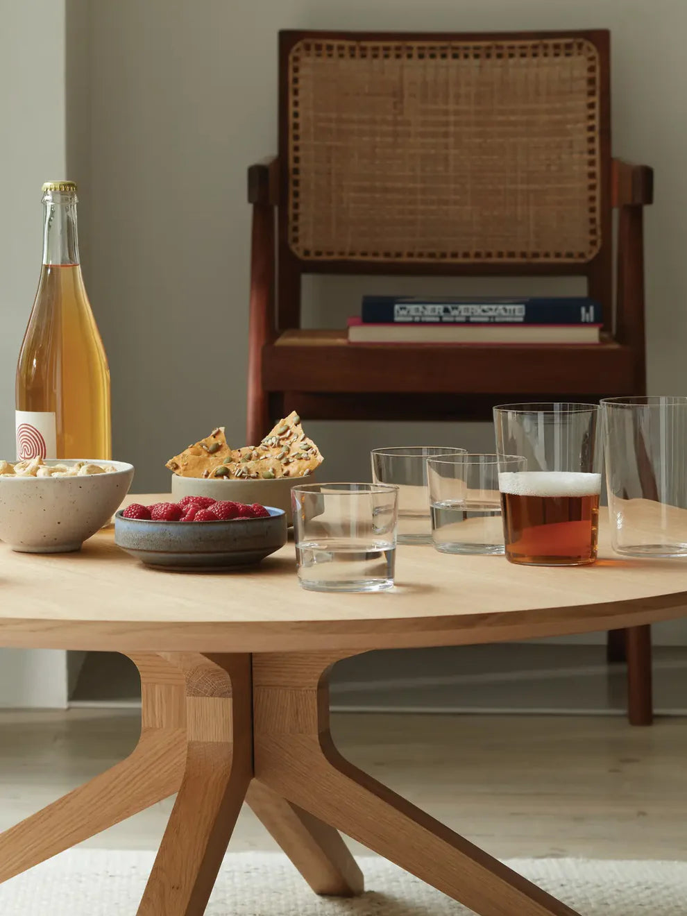 Set of four large, lightweight tumblers with a linear texture. A versatile glass for water, juice and beer, or use as a deep serving dish for breadsticks and desserts. Practical, utilitarian glasses which are stackable and dishwasher safe.