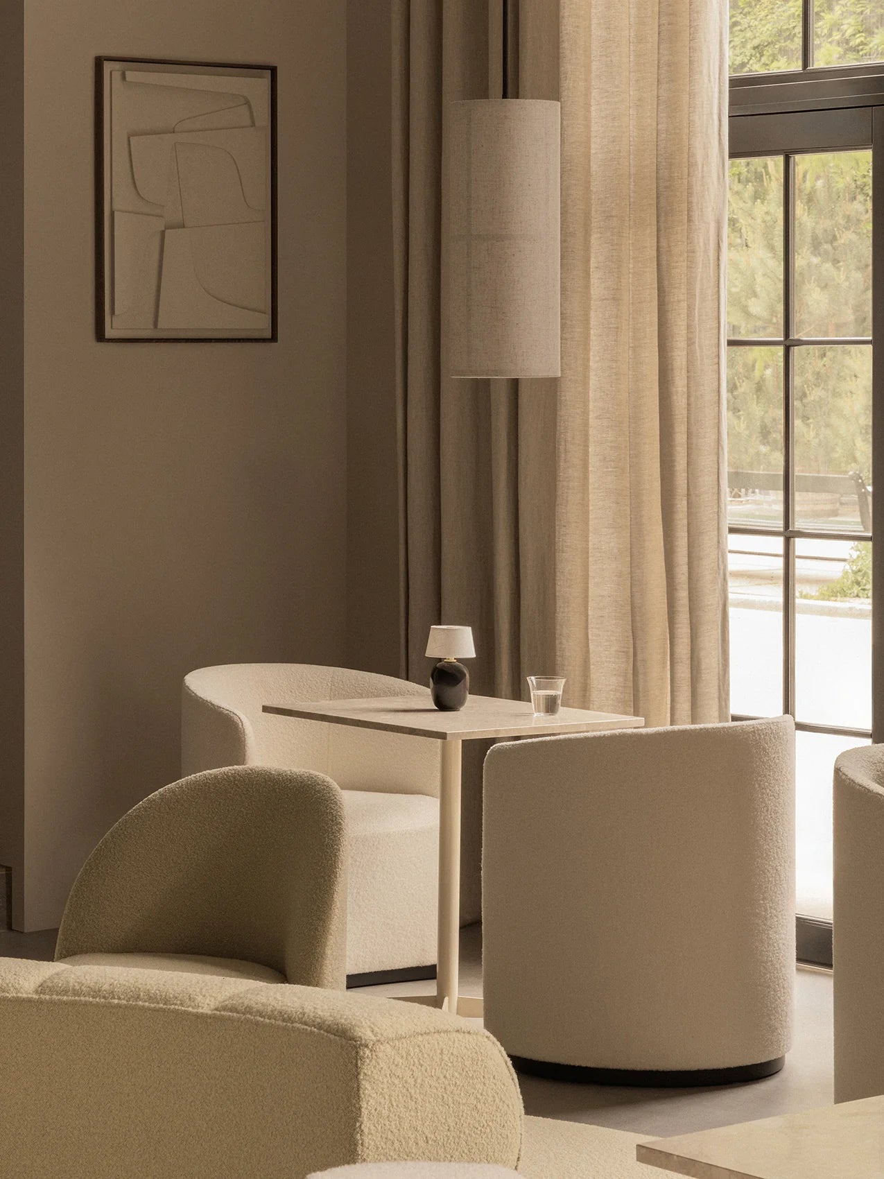 The collection’s pendant light is created with the same column-like shape as the floor and table lamp, carefully covered with translucent fabric that reveals the graphic structure within and suspended from the ceiling by a textile cord. Spreading ambient light in a room, it makes a purposeful pendant above a dining table, in a reception area or hotel bedroom.