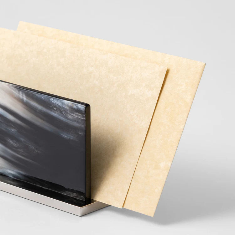 This particular letter holder is made of natural horn, and has a nickel-plated brass base, which is also available in gold. The horn has been wax polished to highlight its natural properties. The color might vary because of the nature of the product. Part of the Leonardo Collection.