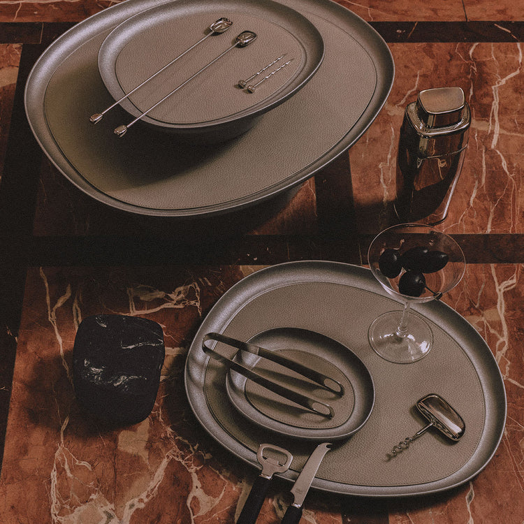 Experience the sophisticated allure of the Maris extra large round raised tray, a striking piece designed by Kelly Wearstler. This tray artfully combines luxury with functionality, showcasing a unique aesthetic inspired by coastal serenity. Meticulously crafted, this tray features a sandblasted aluminum exterior complemented by a removable leather inlay, adding a tactile element that invites engagement. Its generous size makes it perfect for serving snacks or displaying decor, while the non-slip waterproof rubber base ensures stability and durability. The Maris tray epitomizes versatility in design, able to seamlessly adapt to a variety of settings, from modern to traditional. With its graceful curves and organic shapes, it evokes memories of nature’s artistry—smooth pebbles shaped by the ocean or gentle waves retreating from sandy shores. Perfect for both everyday use and special occasions, the Maris tray is an essential addition to any sophisticated tabletop collection.