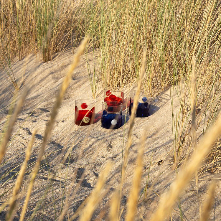 The 'Mezzo e Mezzo' drinking glass celebrates Bassano del Grappa's historic aperitivo through the masterful combination of colored glass. Joined through the Incàlmo technique, these colored drinking glasses celebrate all the playfulness around the aperitif ritual that distinguishes the people of Veneto. Eventually decorated with colored bubbles, these glasses are the perfect choice to add a touch of sparkle to your table setting.