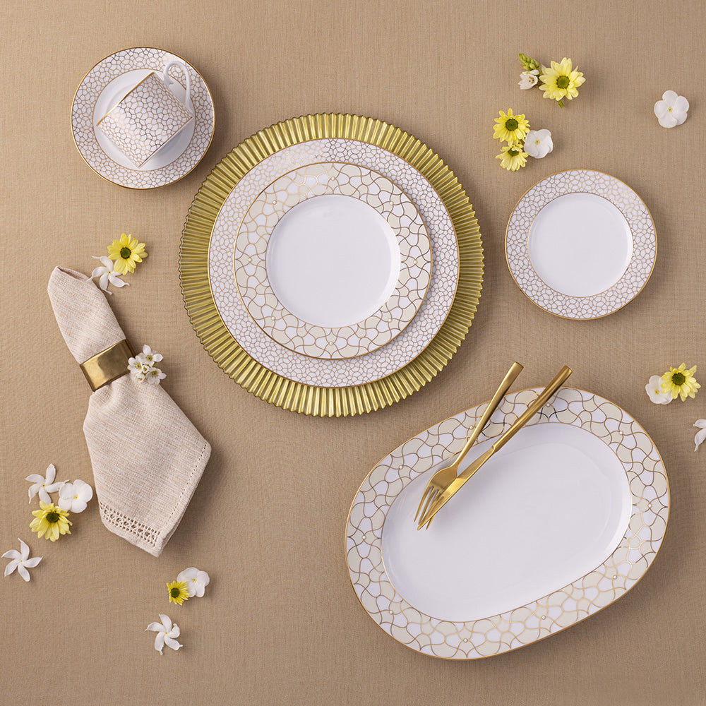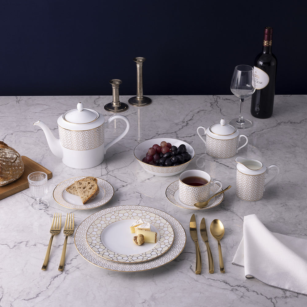 Experience the seamless fusion of timeless elegance and luxurious details with the Noritake Ripple Gold collection. Meticulously crafted from fine porcelain known for its durability, each piece reflects the utmost care and attention to detail. The collection is adorned with exquisite hand-painted gold lines, showcasing intricate designs and a brilliant lustre. This harmonious blend of fine porcelain and opulent gold accents emanates an aura of sophistication and refinement. Whether for daily tea time or special occasions, this set adds a touch of glamour, elevating any table setting and leaving a lasting impression on guests.