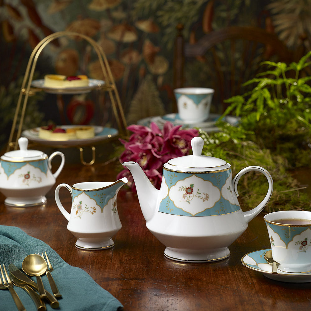 Lodi's Morning is a fine porcelain tea set from Noritake that captures the essence of freshness and elegance, inspired by the beautiful Lodi Gardens in New Delhi. Each item in this collection features striking floral motifs reminiscent of the gardens, showcased in vivid hues of jade with delicate touches of ruby. The delightful pattern is elegantly complemented by delicate gold outer edge banding, adding a finishing touch to this exquisite tea set.