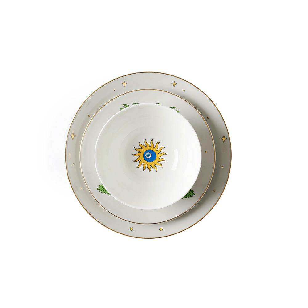 The Nouri collection, designed by Nour Fleihan, meaning “My Light,” is a tableware set inspired by the gentle glow of moonlit nights and the symbolism of protection. Featuring dinner plates, soup and salad bowls, and espresso, tea, and chaffe (gahwa) cups, this collection brings warmth and tranquility to every table setting with delicate designs of palm trees, protective blue eyes, stars, and the serene crescent moon.
