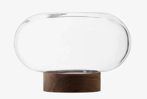The Oblate Vase/Lantern combines hand-blown clear glass with a rich walnut base, creating a modern interplay of transparency and warmth. Use as a lantern for soft candlelight or as a wide vase for expressive floral arrangements.