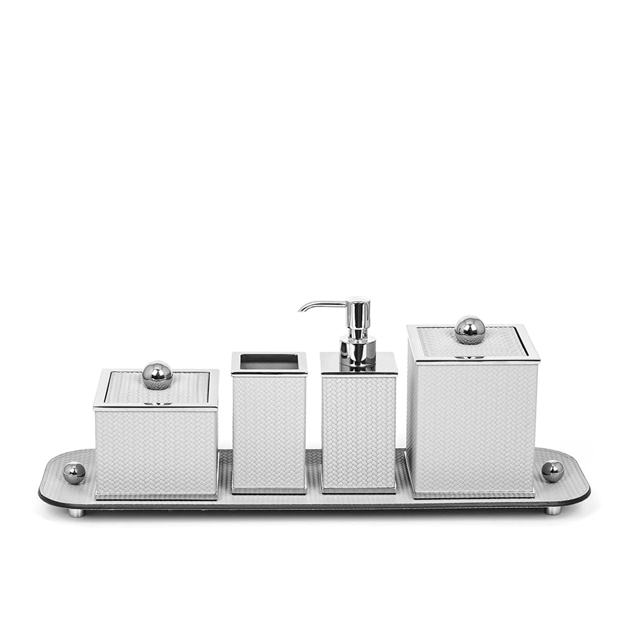 Our small tray, together with a square soap dispenser and a toothbrush holder. A complete set with all the bathroom essentials presented here in a square shape. Clean, crisp lines with perfect accents made in chrome, gold and burnished brass to finish the usual elegance of our leather upholstery.