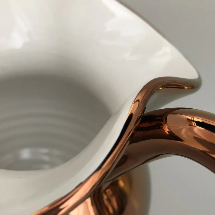 Inspired by the shape of the Venetian tricorn hat, the 1.2 L Torcello Carafe is an elegant example of fine craftsmanship. Handturned in white terracotta with the exterior finished in bronze using a soft bristle brush, each piece is uniquely shaped by hand and offers the possibility of customizing with a short piece of text underneath the item.