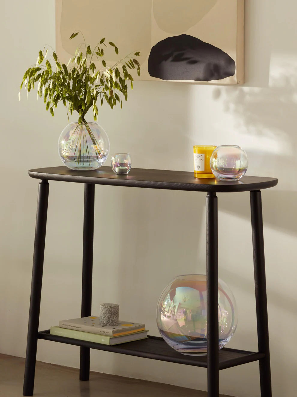 A small mouth-blown glass vase with a spherical shape, hand painted with iridescent lustre.
