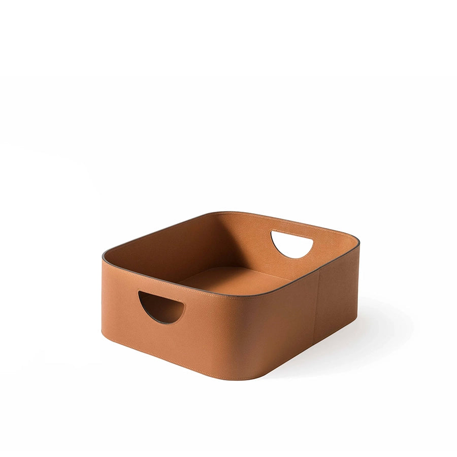 A box made with the resistant regenerated leather with two practical holes as handles on the short sides. Available in two different sizes, with a classic neutral colors palette.