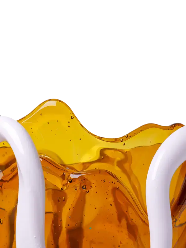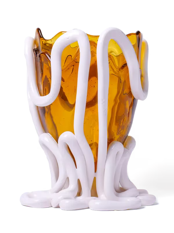 Honeyed in the colour of afternoon skies, this Indian Summer Vase Large in Clear Amber White brings design history to your home. A 1995 concept for Fish Design made from resin and finished with the politic dimensions and spaghetti drippings, the vase represents Gaetano Pesce’s innovative fish designs, which became a signature in the design history.