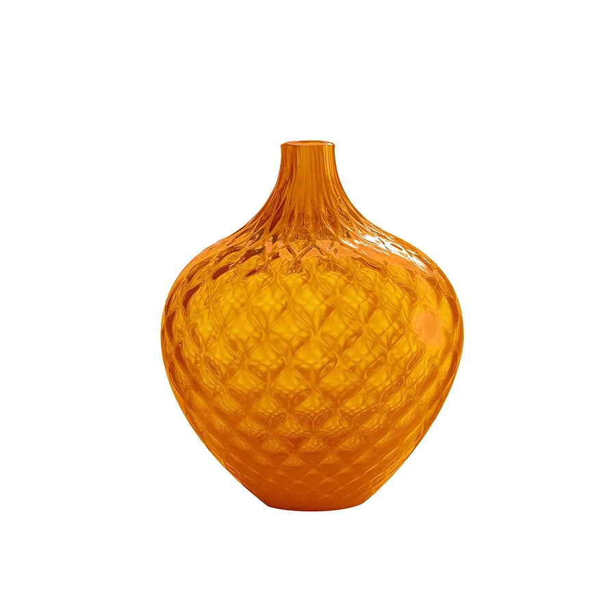 Fresh and vibrant, this orange-toned decorative vase in prized Murano glass is sure to perk up corners of contemporary decors needing a pop of color. The extensive balloton texture - a milestone of Muranese glassblowing tradition - captures the eye while inviting to lean on the generous bulging silhouette progressively tapering to a narrow neck. More color options are available.