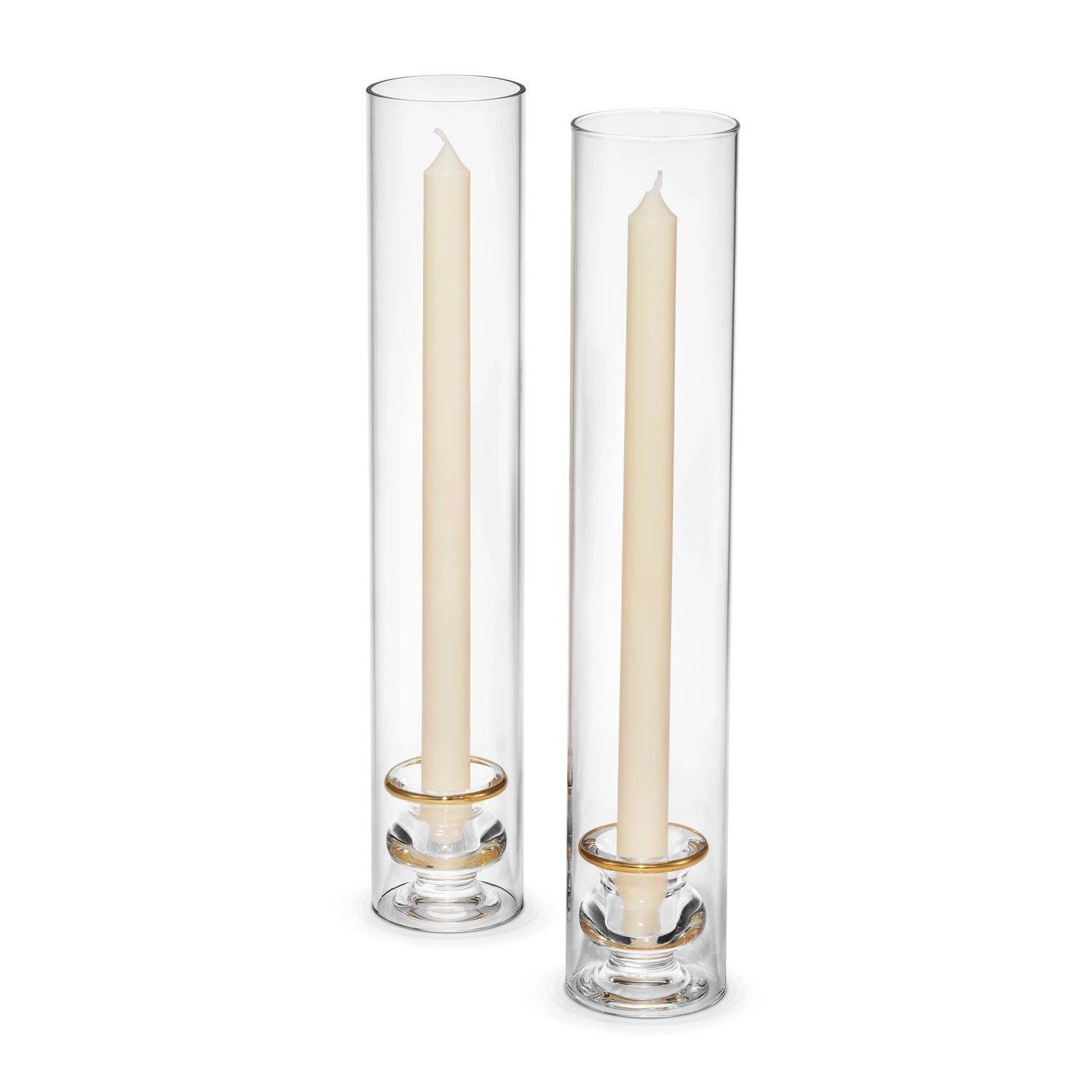 Minimal and elegant, this set of two Sancia taper holders brings a refined touch to any table setting. Finished with a hand-painted gold rim, it creates a soft, warm glow when lit. Each holder is set within a clear glass sleeve, combining a contemporary look with practical functionality—especially ideal for outdoor dining.