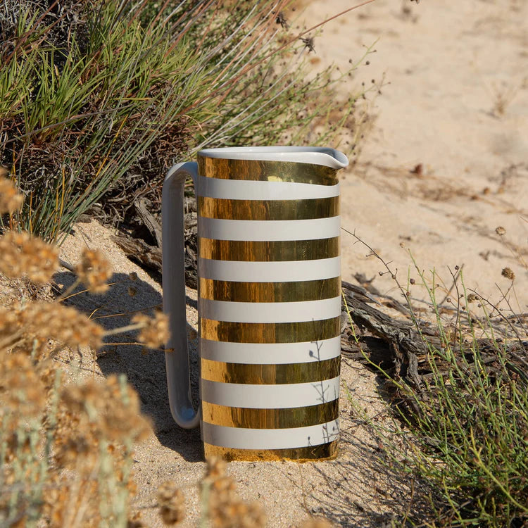Bring a touch of Venetian aesthetic with the Terzo Fuoco 'Serlio' Gondoliere pitcher, the one and only ceramic carafe with a linear handle. Handthrown in white terracotta, the stunning Serlio Carafe is a beautiful example of fine Italian craftsmanship. Enhance any table with Tuttoattacato's minimalistic design, emphasizing any classic or contemporary dinnerware with its elegant design and quality. Fired multiple times, the Copper stripes evoke the timeless pattern of the Gondolier's shirt.