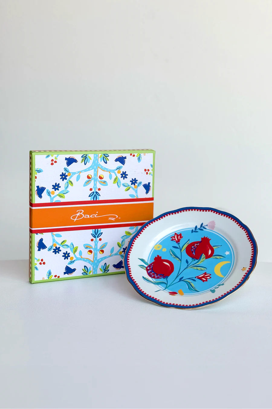Dessert Plate made of porcelain from the 'Mamma Mia' collection, designed to infuse vitality not only on the table but also in every corner of the home through a kaleidoscope of colors, intriguing symbols, mysterious writings, and captivating designs