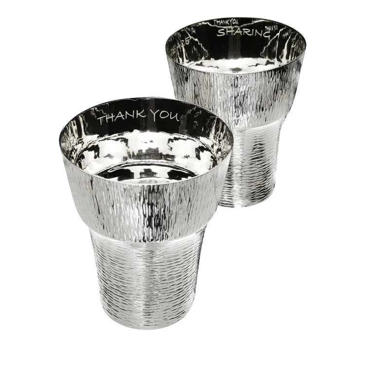 This striking glass is entirely made in a silver alloy and its bright surface is glossy and smooth on the inside, while the exterior shows small grooves that run horizontally along the half-cone of the body and vertically on the wide lip above it. The classic shape of a glass is reinvented with the choice of this bright and reflecting material that will add splashes of light to a dinner table or a living room during cocktail hour.