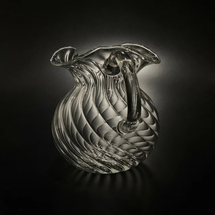 Enhance your table with the 'Torcello' torchon Glass Pitcher. Widely adopted in the 1900s in Venetian taverns to mix and serve sparkling cocktails like Bellini and Rossini, Its Iconic design recalls the shape of the Venetian tricorn hat with three lobes. Each jug is handblown without the use of moulds, making each creation unique and certifying its authenticity. The jug has an internal ribbing and it's flame-decorated with colored glass rods. Ideal for serving Ice-cold cocktails or Hot Drinks, it brings a timeless Italian feeling