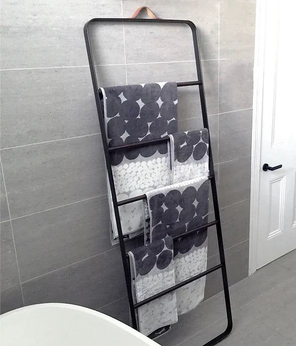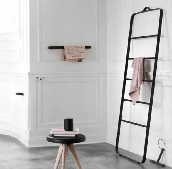 The Towel Ladder serves multiple purposes, whether in the bathroom for towels and accessories, in the bedroom for clothes, or in the hallway for scarves and coats. Its portable nature allows for easy movement around the house, while the leather strap at the top adds a touch of sophistication and makes it reminiscent of an oversized suitcase.