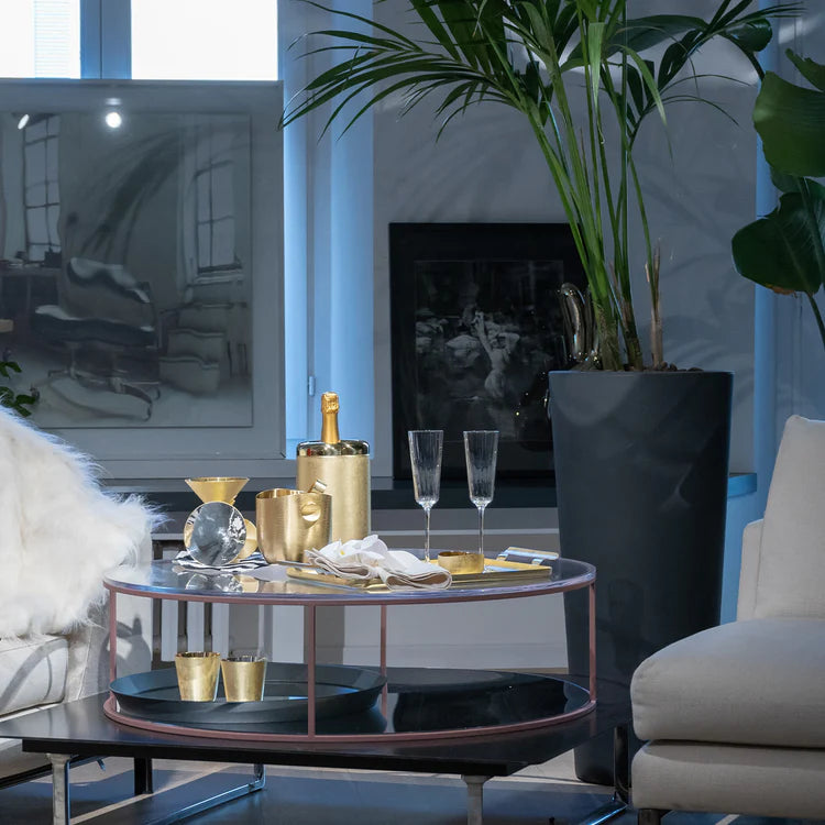 When brass and texture become Velvet for table jewels, for an exceptional mise an place. The brass is worked with the unique Zanetto know-how and special hammering to obtain a surface that is like velvet to the touch. Gold plated glasses with fine workmanship making them stainless and more resistant to different types of beverages.