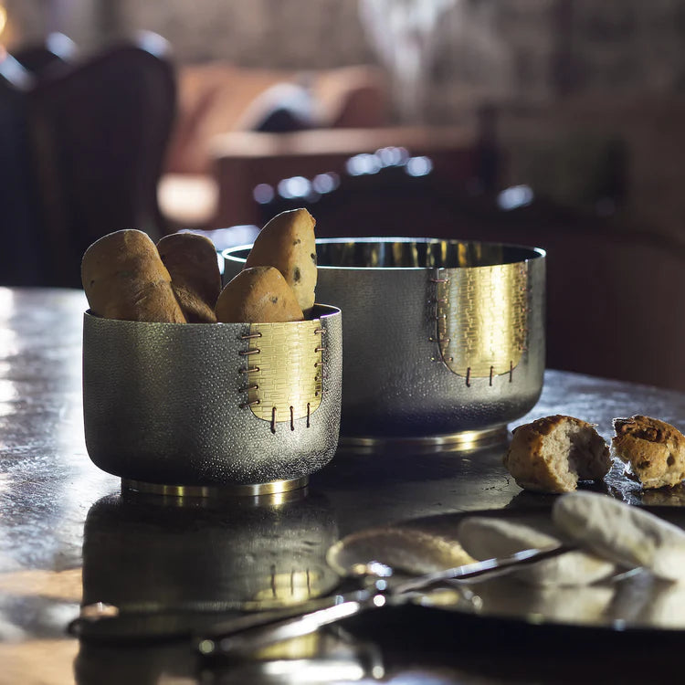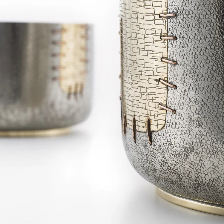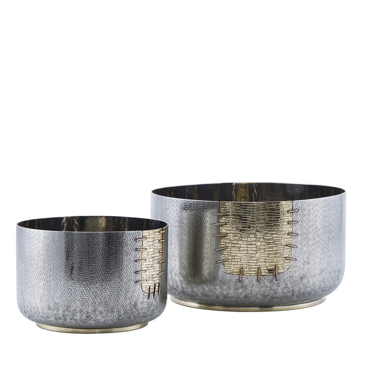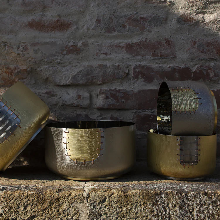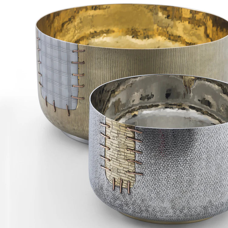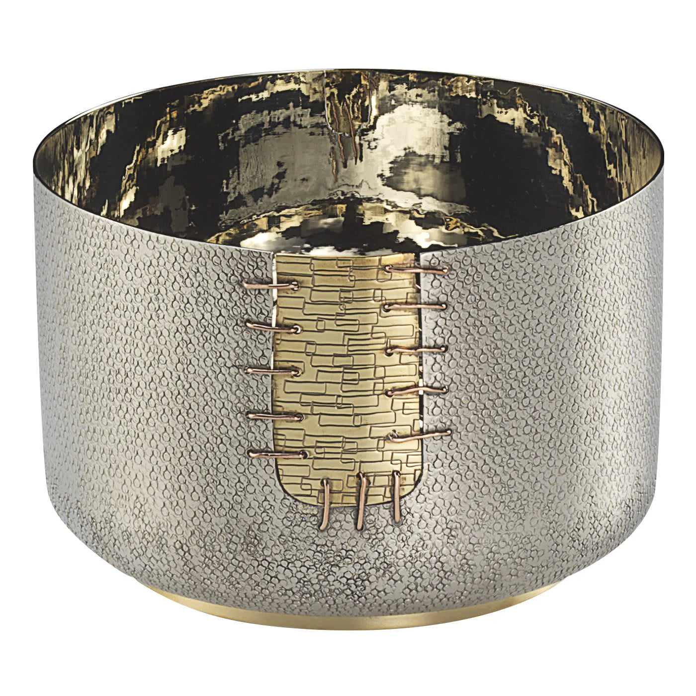 This bowl is a versatile and striking addition to any modern home where, both as a vase or a centerpiece, it will make a statement. Its simple silhouette is adorned with a decorative patch that seems to have been sewn on it. Part of a limited series, the copper, white bronze, and brass used reflect the surrounding light in a unique way, while the patch symbolizes the quest to repair and not throw away broken objects, according to the Japanese philosophy of Kintsugi.