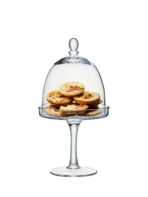 A small mouth-blown glass cakestand and dome with slim knob handle. Designed for small cakes or petits fours.