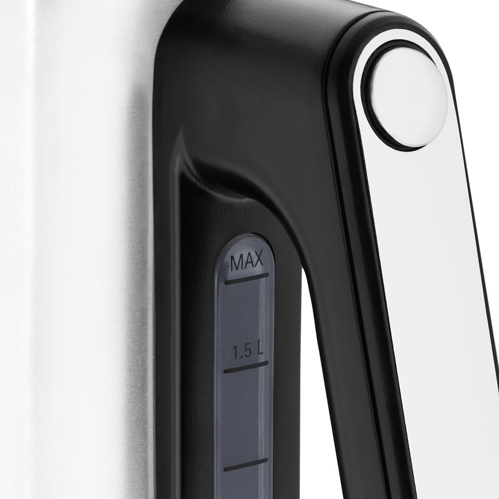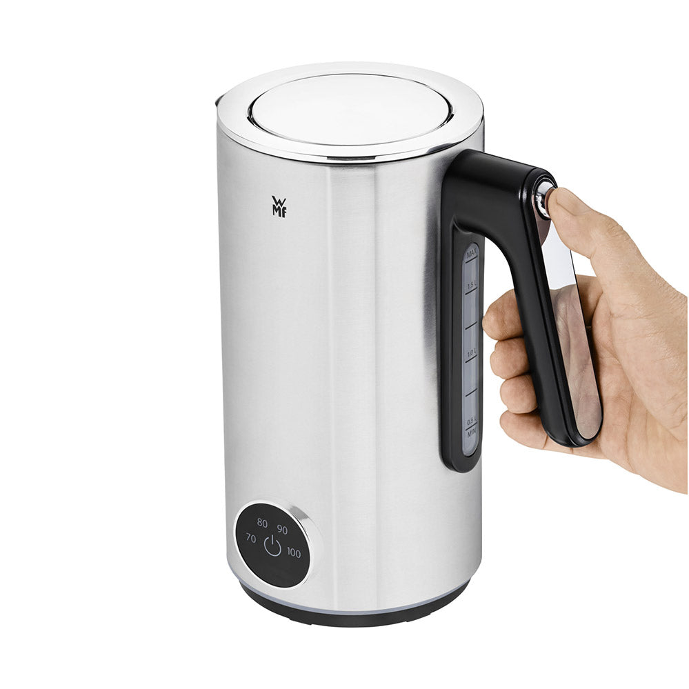 The WMF Lumero kettle is a versatile, 1.6L capacity appliance with 4 temperature options and LED lighting. Ideal for daily use and entertaining, it features a cordless design, 360° base with cord winder, and modern LED lights for added style. The kettle offers four variable temperature settings (70, 80, 90, and 100 degrees) with easy one-handed opening, an external water level indicator, and enhanced safety features such as dry run and overheating protection, automatic boiling cut-off, and a smart locking lid.